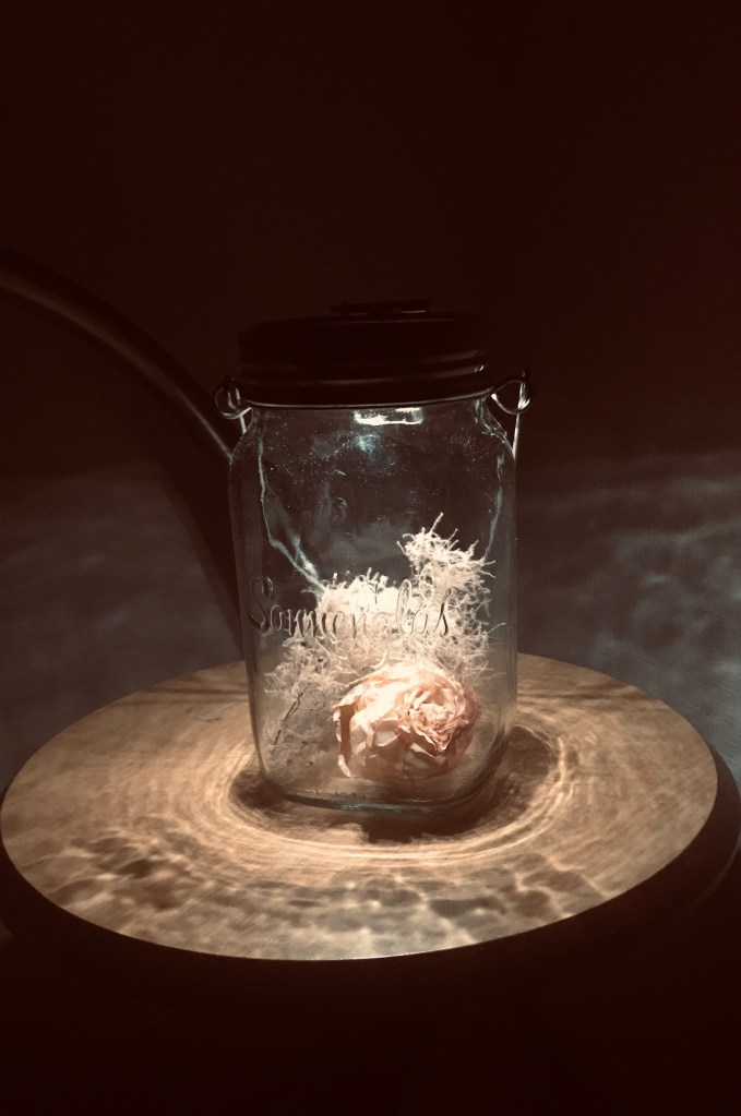 私は花屋で働いている為、花の種類は詳しい、組み合わせも自信がある…ですが、やっぱらシンプルが一番という事で、バラとスモークツリーの2種類にしました。ソネングラスの優しいあかりと、ドライフラワーがマッチした、自信作が出来あがりました。皆さまいかがですか?